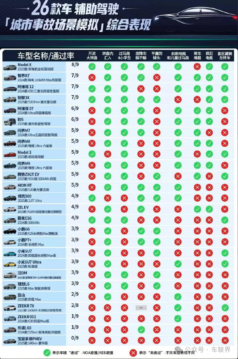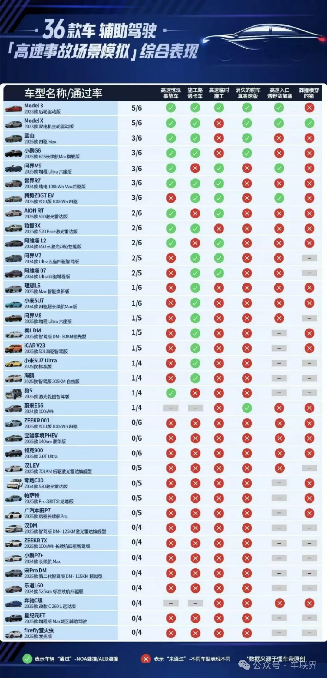 不是我说,这次测试堪称“地狱级别”——15公里封闭路段,一堆高难度真实事故场景,车流、障碍物、突发情况一个不落,活脱脱就是现实马路杀手的合集。懂车帝这次是真下狠手了,直接拉了将近40款市面上最火的车型上阵“考试”。 高速场景通过率仅24%,城市场景为44.2%。结果一出,全场哗然。华为系车型虽表现不俗但极端场景稳定性不足,小米SU7等热门车型更是暴露出基础场景识别缺陷。特斯拉一骑绝尘,稳如老狗,仿佛在说:“你们这叫辅助驾驶?我这叫自动驾驶。”而一众国产智驾“学霸”,平日里各种宣传吹得天花乱坠,结果一碰上真场景,集体表演翻车现场,有的刹不住,有的绕不过,有的直接装傻——这哪是辅助驾驶?这是“辅助送命”吧?