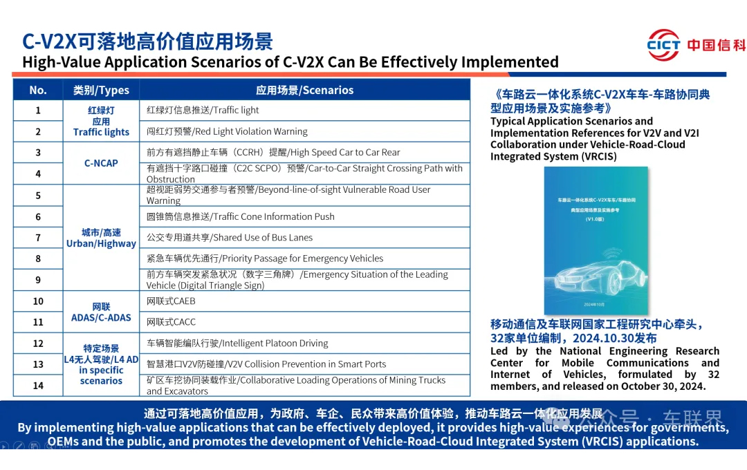 2024年10月,由移动通信及车联网国家工程研究中心牵头32家单位参与共同编制的《车路云一体化系统C-V2X车车/车路协同典型应用场景及实施参考》选取了14个典型应用场景进行分析并提出实施参考。
