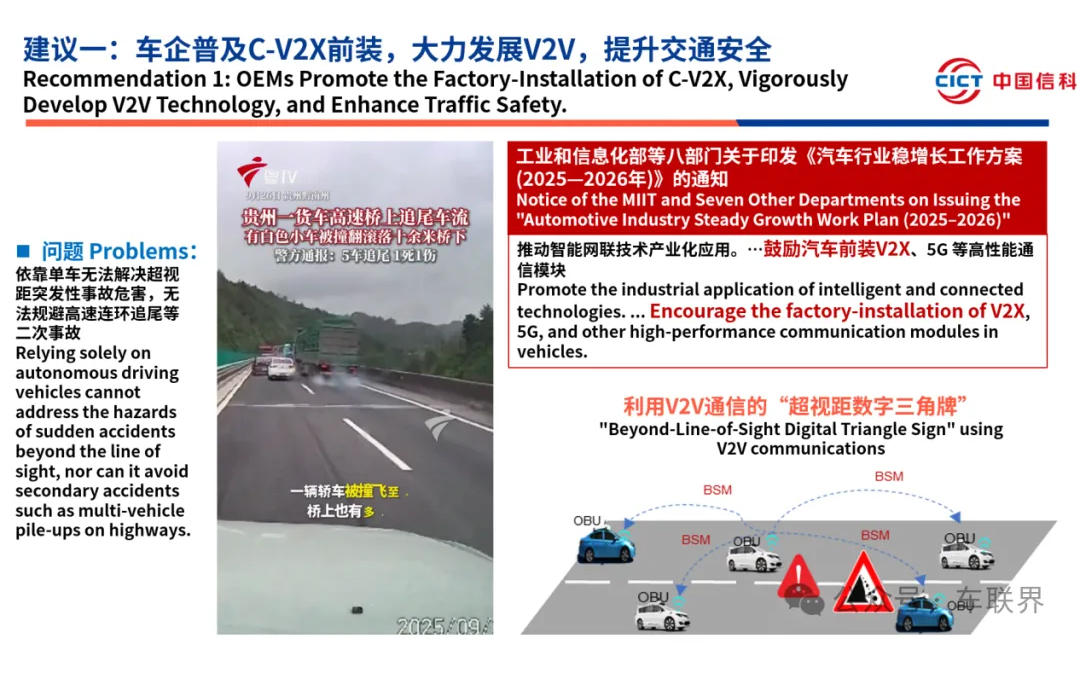 建议一:车企普及C-V2X前装,大力发展V2V,提升交通安全